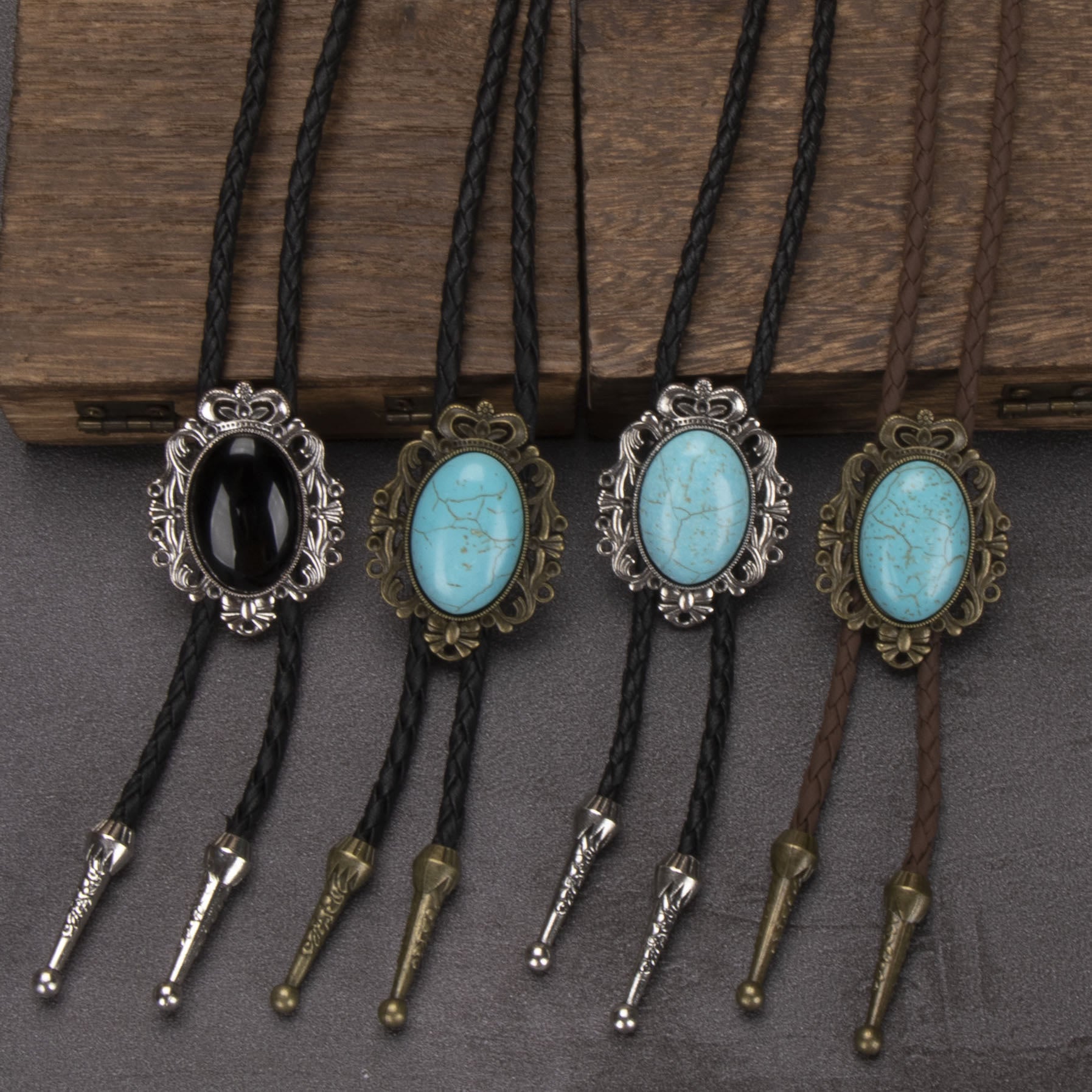 Bolo-Krawatte mit elliptischem Anhänger im Retro-Western-Stil in Türkis