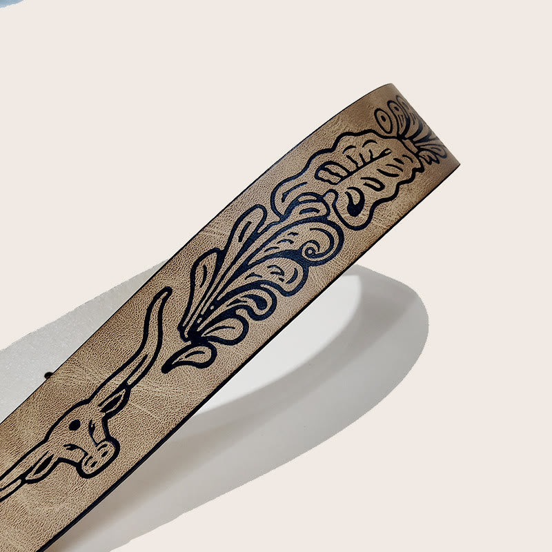 • Die Oberfläche dieses Gürtels ist mit schwarzen Mustern graviert, was ihm einen Vintage-Look verleiht. Die Schnalle ist in Form eines Stierschädels gestaltet, mit exquisiten Details und vielen Western-Elementen.