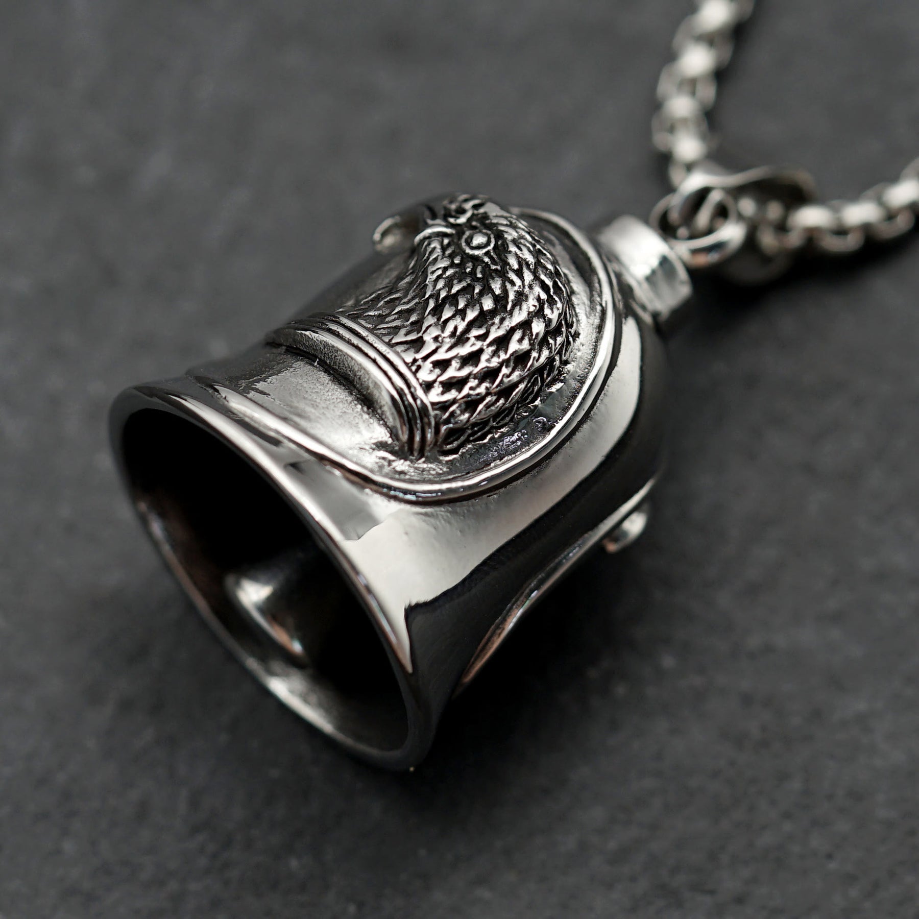 • Dieser Schlüsselanhänger ist mit einem auffälligen Adleremblem auf einer detailreichen Reitglocke versehen und strahlt einen kantigen, rebellischen Geist aus.