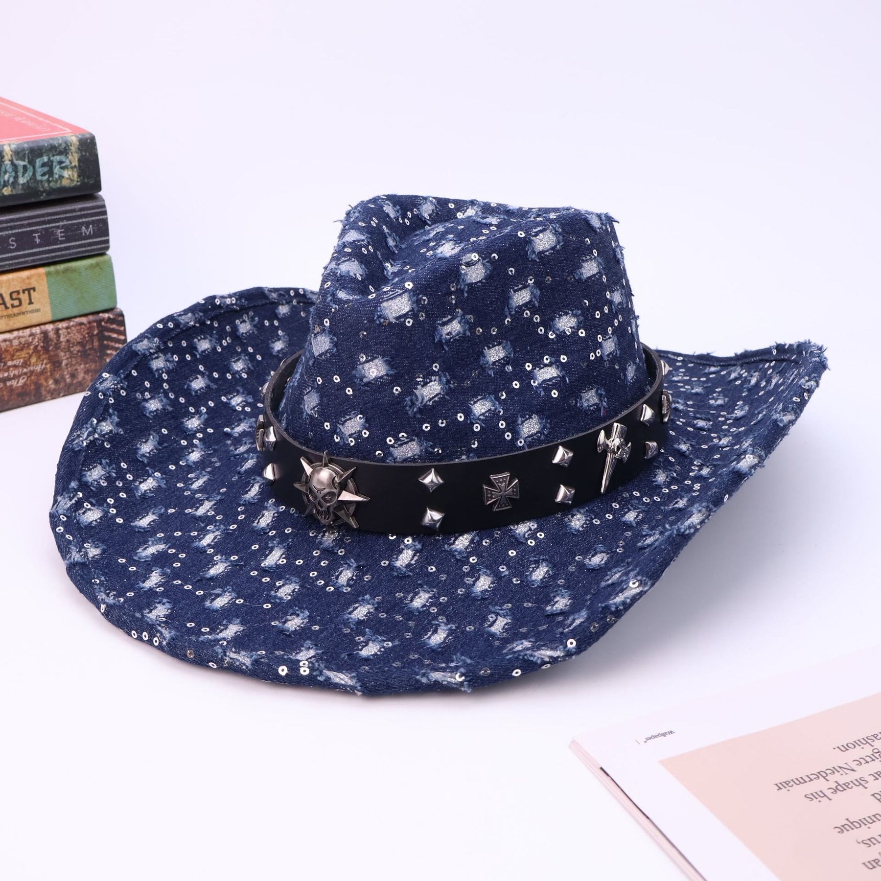 Dieser Cowboyhut wird mit einem schwarzen Lederriemen kombiniert, der mit Accessoires im Punk-Stil wie Metallnieten, Totenköpfen und Kreuzen verziert ist. Er ist ideal für Winterreisen und hält warm.