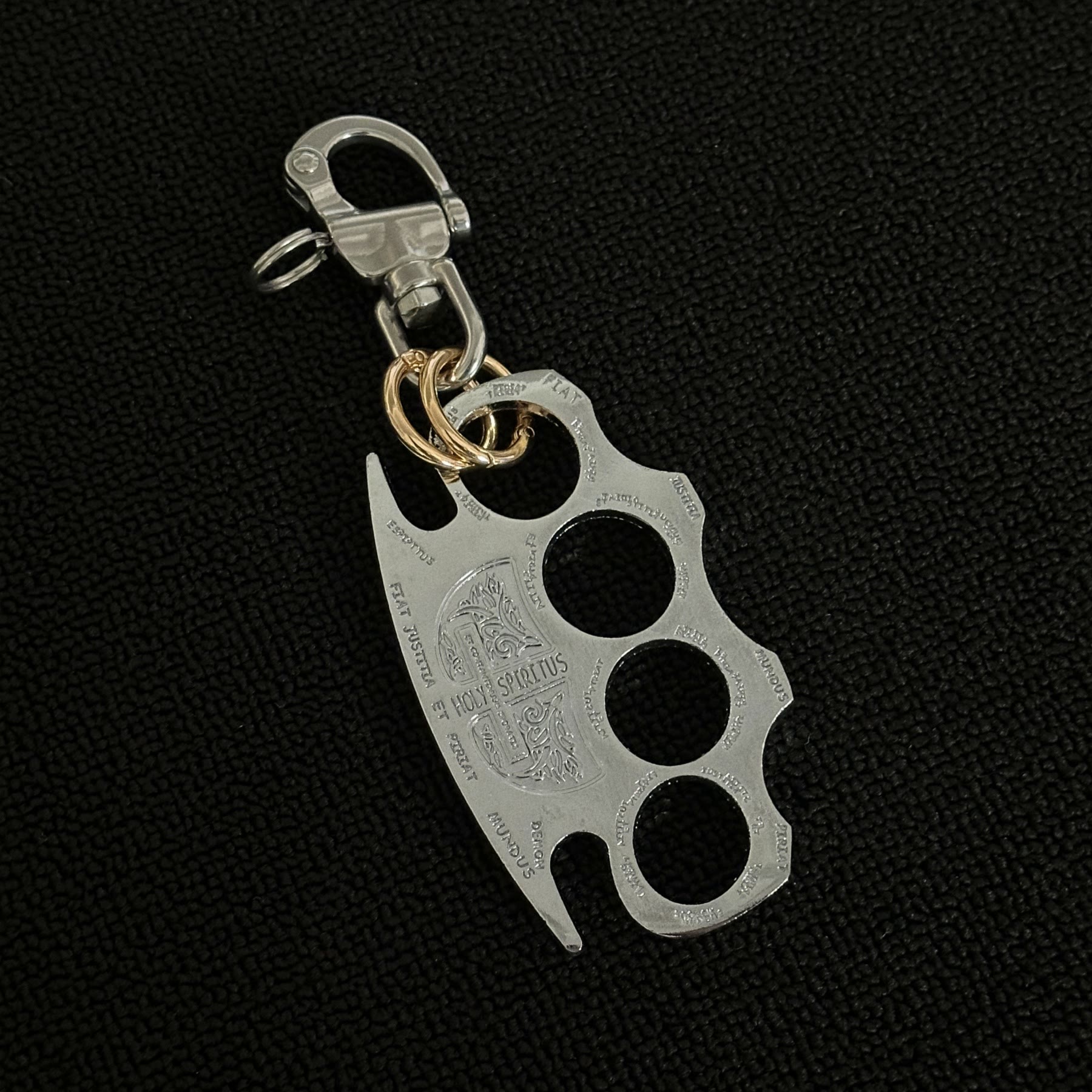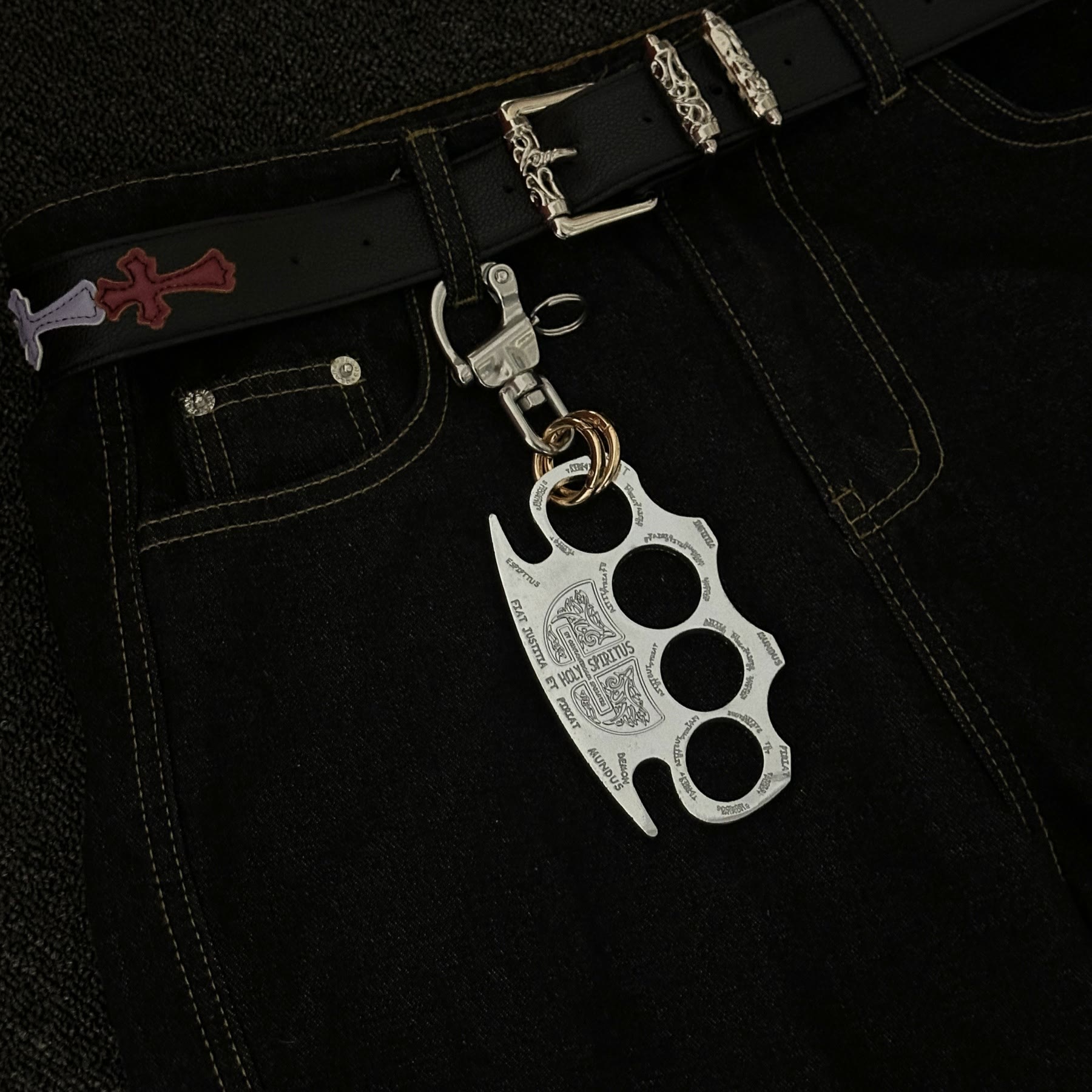 Dieser Schlüsselanhänger besteht aus einer robusten Legierung mit einer polierten Silberoberfläche. Sein Design in Form eines Schlagrings gewährleistet ein gewisses Maß an Selbstverteidigungsfähigkeit und eignet sich daher sowohl als alltägliches Dekorationsaccessoire als auch zum Selbstschutz bei bestimmten Anlässen.